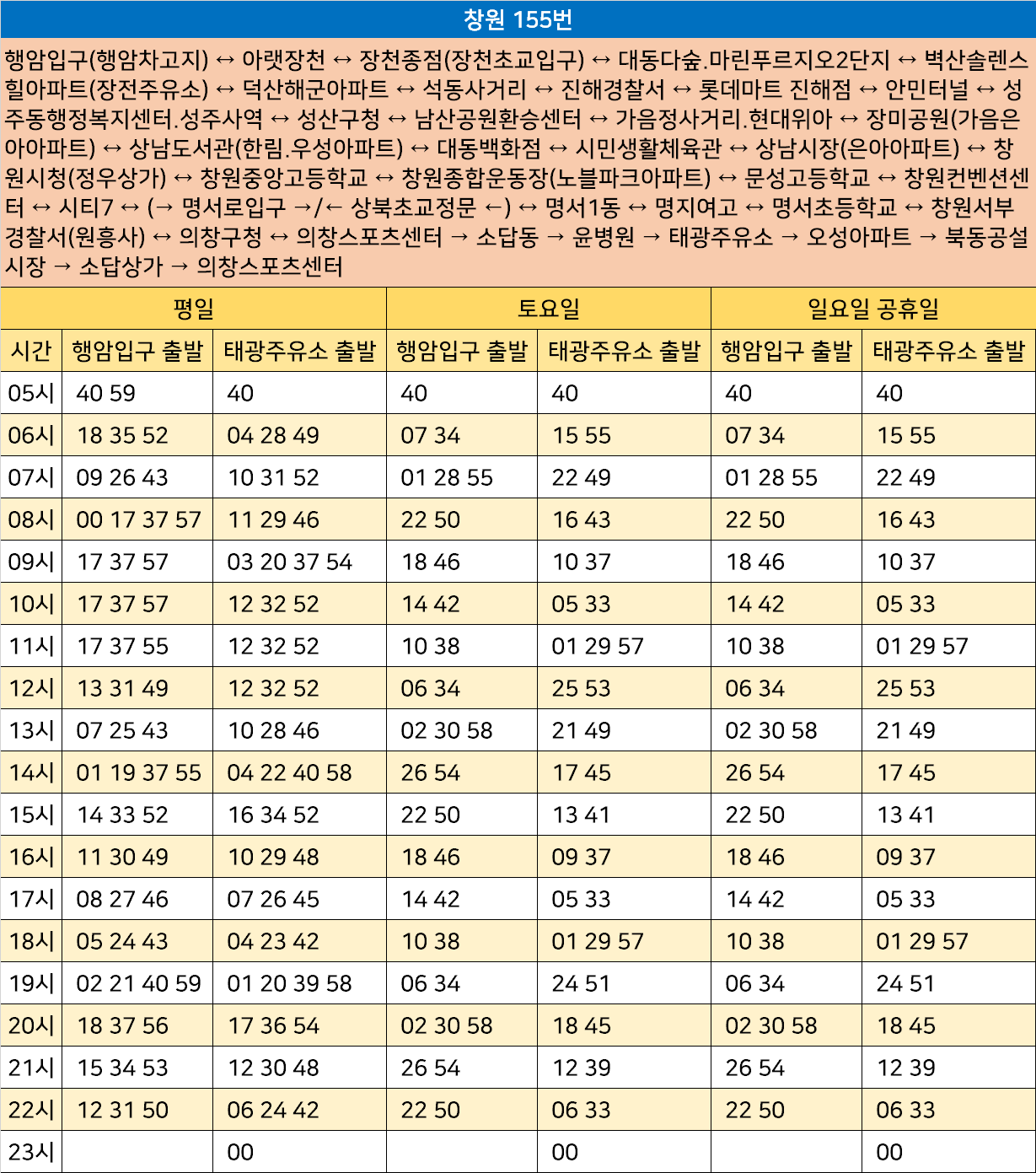 창원 155번: 행암입구(행암차고지) ↔ 아랫장천 ↔ 장천종점(장천초교입구) ↔ 대동다숲.마린푸르지오2단지 ↔ 벽산솔렌스힐아파트(장전주유소) ↔ 덕산해군아파트 ↔ 석동사거리 ↔ 진해경찰서 ↔ 롯데마트 진해점 ↔ 안민터널 ↔ 성주동행정복지센터.성주사역 ↔ 성산구청 ↔ 남산공원환승센터 ↔ 가음정사거리.현대위아 ↔ 장미공원(가음은아아파트) ↔ 상남도서관(한림.우성아파트) ↔ 대동백화점 ↔ 시민생활체육관 ↔ 상남시장(은아아파트) ↔ 창원시청(정우상가) ↔ 창원중앙고등학교 ↔ 창원종합운동장(노블파크아파트) ↔ 문성고등학교 ↔ 창원컨벤션센터 ↔ 시티7 ↔ (→ 명서로입구 →/← 상북초교정문 ←) ↔ 명서1동 ↔ 명지여고 ↔ 명서초등학교 ↔ 창원서부경찰서(원흥사) ↔ 의창구청 ↔ 의창스포츠센터 → 소답동 → 윤병원 → 태광주유소 → 오성아파트 → 북동공설시장 → 소답상가 → 의창스포츠센터