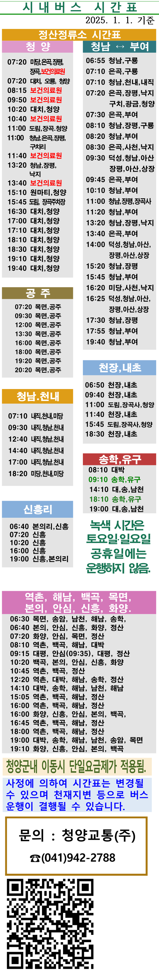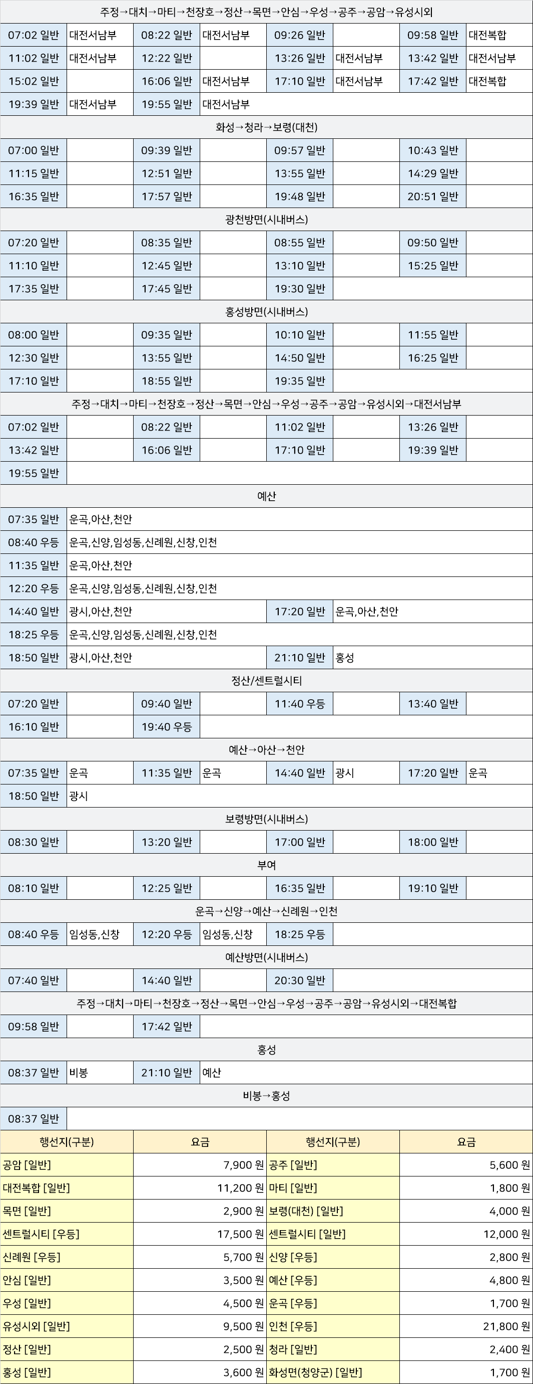 청양 시외버스 터미널 시간표/요금표 2025년 04월 16일 기준