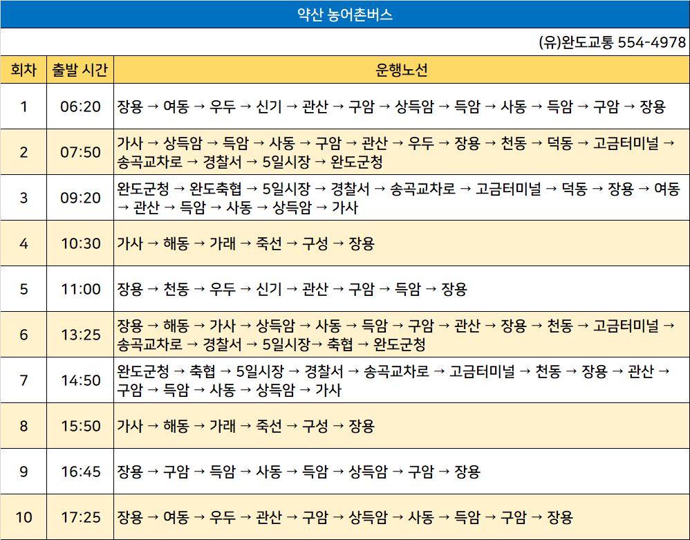 ●약산 농어촌버스 노선정보: 장용 → 여동 → 우두 → 신기 → 관산 → 구암 → 상득암 → 득암 → 사동 → 득암 → 구암 → 장용, 가사 → 상득암 → 득암 → 사동 → 구암 → 관산 → 우두 → 장용 → 천동 → 덕동 → 고금터미널 → 송곡교차로 → 경찰서 → 5일시장 → 완도군청, 완도군청 → 완도축협 → 5일시장 → 경찰서 → 송곡교차로 → 고금터미널 → 덕동 → 장용 → 여동 → 관산 → 득암 → 사동 → 상득암 → 가사, 가사 → 해동 → 가래 → 죽선 → 구성 → 장용, 장용 → 천동 → 우두 → 신기 → 관산 → 구암 → 득암 → 장용, 장용 → 해동 → 가사 → 상득암 → 사동 → 득암 → 구암 → 관산 → 장용 → 천동 → 고금터미널 → 송곡교차로 → 경찰서 → 5일시장→ 축협 → 완도군청, 완도군청 → 축협 → 5일시장 → 경찰서 → 송곡교차로 → 고금터미널 → 천동 → 장용 → 관산 → 구암 → 득암 → 사동 → 상득암 → 가사, 장용 → 구암 → 득암 → 사동 → 득암 → 상득암 → 구암 → 장용, 장용 → 여동 → 우두 → 관산 → 구암 → 상득암 → 사동 → 득암 → 구암 → 장용