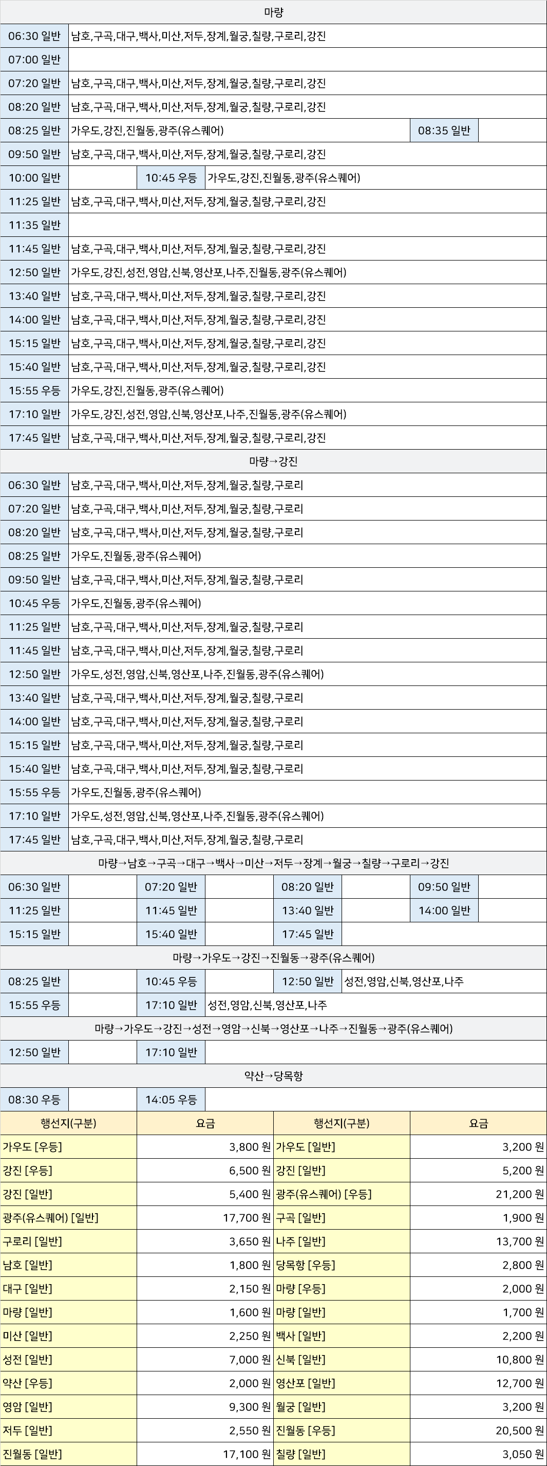 고금시외고속버스터미널 고금정류장 고금정류소 → "마량→가우도→강진→성전→영암→신북→영산포→나주→진월동→광주(유스퀘어),마량→가우도→강진→진월동→광주(유스퀘어),마량→강진,마량→남호→구곡→대구→백사→미산→저두→장계→월궁→칠량→구로리→강진,약산→당목항".