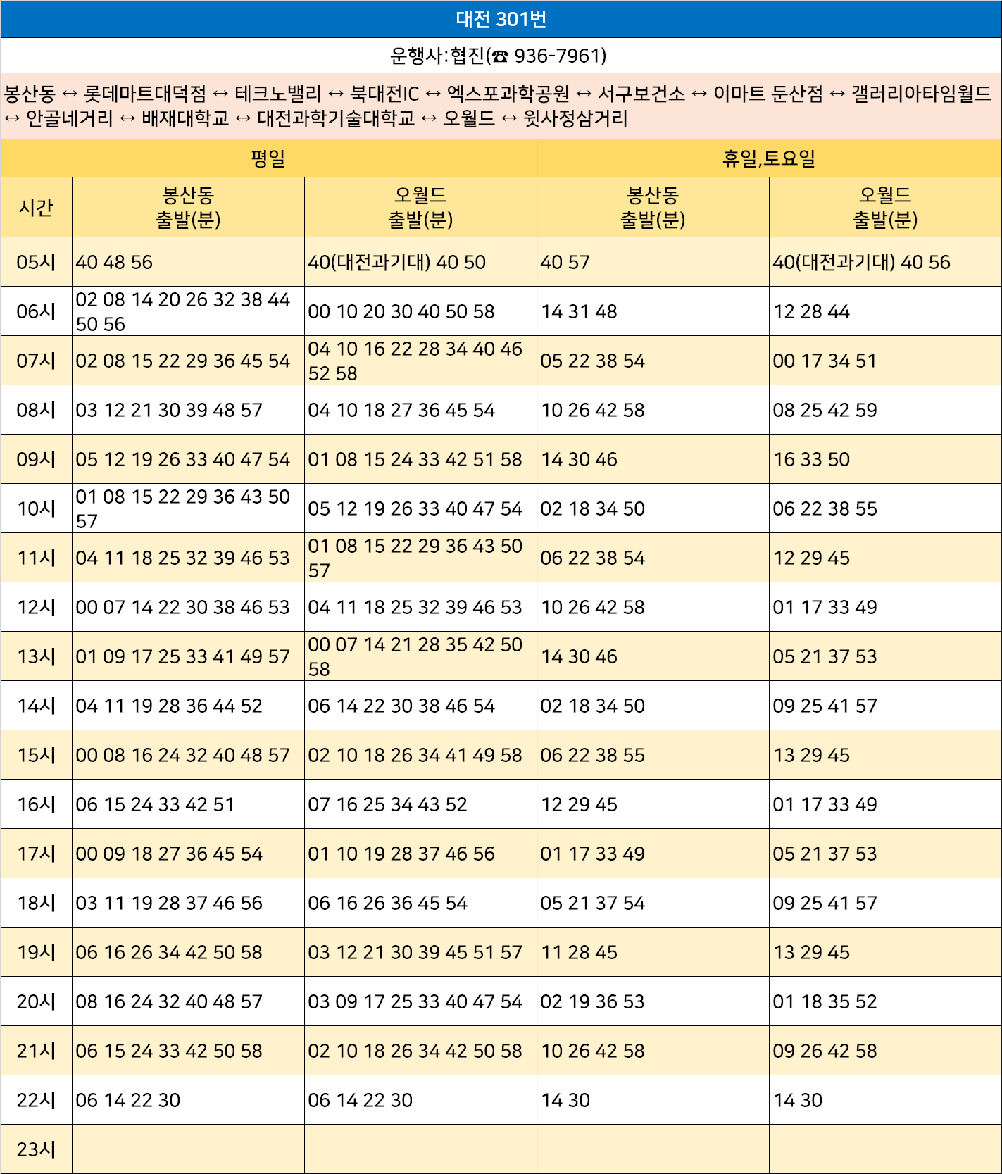 대전 301번: 봉산동 ↔ 롯데마트대덕점 ↔ 테크노밸리 ↔ 북대전IC ↔ 엑스포과학공원 ↔ 서구보건소 ↔ 이마트 둔산점 ↔ 갤러리아타임월드 ↔ 안골네거리 ↔ 배재대학교 ↔ 대전과학기술대학교 ↔ 오월드 ↔ 윗사정삼거리