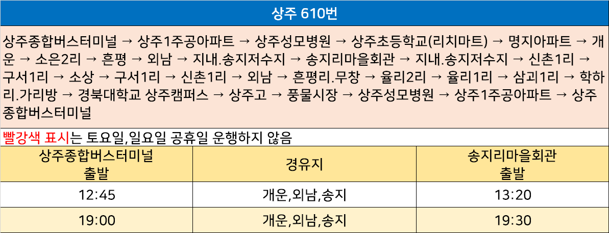 상주 610번: 상주종합버스터미널 → 상주1주공아파트 → 상주성모병원 → 상주초등학교(리치마트) → 명지아파트 → 개운 → 소은2리 → 흔평 → 외남 → 지내.송지저수지 → 송지리마을회관 → 지내.송지저수지 → 신촌1리 → 구서1리 → 소상 → 구서1리 → 신촌1리 → 외남 → 흔평리.무창 → 율리2리 → 율리1리 → 삼괴1리 → 학하리.가리방 → 경북대학교 상주캠퍼스 → 상주고 → 풍물시장 → 상주성모병원 → 상주1주공아파트 → 상주종합버스터미널