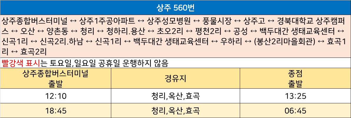 상주 560번: 상주종합버스터미널 ↔ 상주1주공아파트 ↔ 상주성모병원 ↔ 풍물시장 ↔ 상주고 ↔ 경북대학교 상주캠퍼스 ↔ 오산 ↔ 양촌동 ↔ 청리 ↔ 청하리.용산 ↔ 초오2리 ↔ 평천2리 ↔ 공성 ↔ 백두대간 생태교육센터 ↔ 신곡1리 ↔ 신곡2리.하남 ↔ 신곡1리 ↔ 백두대간 생태교육센터 ↔ 우하리 ↔ (봉산2리마을회관) ↔ 효곡1리 ↔ 효곡2리