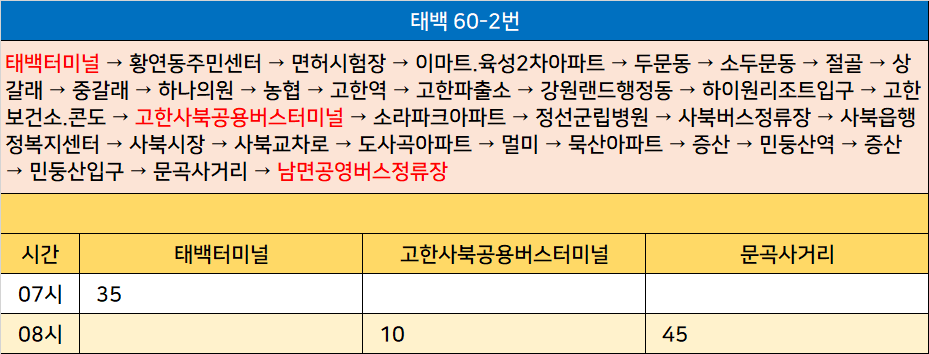태백 60-2번: 태백터미널 → 황연동주민센터 → 면허시험장 → 이마트.육성2차아파트 → 두문동 → 소두문동 → 절골 → 상갈래 → 중갈래 → 하나의원 → 농협 → 고한역 → 고한파출소 → 강원랜드행정동 → 하이원리조트입구 → 고한보건소.콘도 → 고한사북공용버스터미널 → 소라파크아파트 → 정선군립병원 → 사북버스정류장 → 사북읍행정복지센터 → 사북시장 → 사북교차로 → 도사곡아파트 → 멀미 → 묵산아파트 → 증산 → 민둥산역 → 증산 → 민둥산입구 → 문곡사거리 → 남면공영버스정류장
