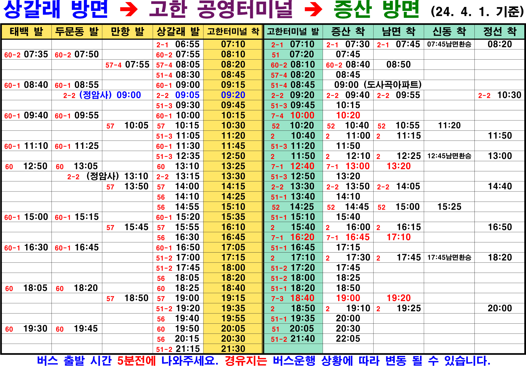 정선 → 신동 → 남면 → 증산 → 고한터미널 → 상갈래 → 만항 → 두문동 → 태백, 태백 → 두문동 → 만항 → 상갈래 → 고한터미널 → 증산 → 남면 → 신동 → 정선, 도사곡아파트, 정암사