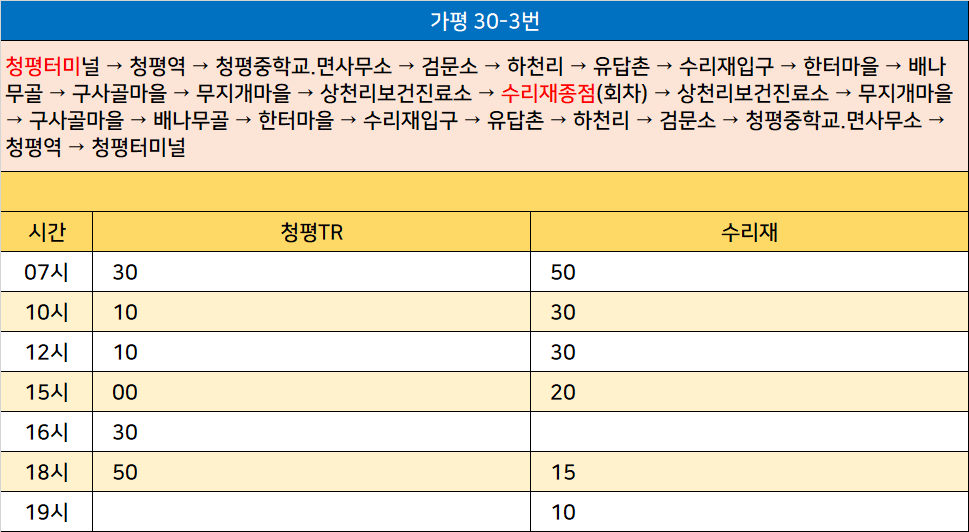 가평 30-3번: 청평터미널 → 청평역 → 청평중학교.면사무소 → 검문소 → 하천리 → 유답촌 → 수리재입구 → 한터마을 → 배나무골 → 구사골마을 → 무지개마을 → 상천리보건진료소 → 수리재종점(회차) → 상천리보건진료소 → 무지개마을 → 구사골마을 → 배나무골 → 한터마을 → 수리재입구 → 유답촌 → 하천리 → 검문소 → 청평중학교.면사무소 → 청평역 → 청평터미널