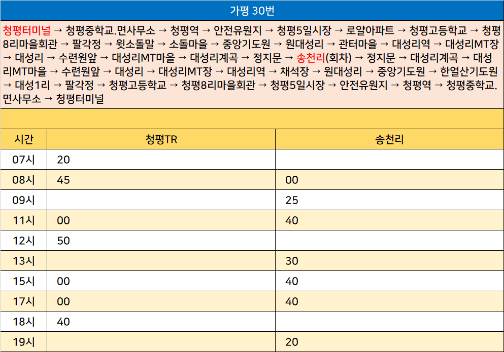 가평 30번: 청평터미널 → 청평중학교.면사무소 → 청평역 → 안전유원지 → 청평5일시장 → 로얄아파트 → 청평고등학교 → 청평8리마을회관 → 팔각정 → 윗소돌말 → 소돌마을 → 중앙기도원 → 원대성리 → 관터마을 → 대성리역 → 대성리MT장 → 대성리 → 수련원앞 → 대성리MT마을 → 대성리계곡 → 정지문 → 송천리(회차) → 정지문 → 대성리계곡 → 대성리MT마을 → 수련원앞 → 대성리 → 대성리MT장 → 대성리역 → 채석장 → 원대성리 → 중앙기도원 → 한얼산기도원 → 대성1리 → 팔각정 → 청평고등학교 → 청평8리마을회관 → 청평5일시장 → 안전유원지 → 청평역 → 청평중학교.면사무소 → 청평터미널