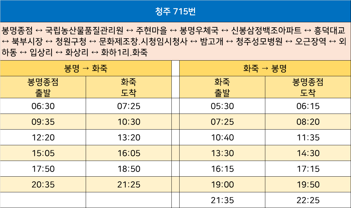청주 715번: 봉명종점 ↔ 국립농산물품질관리원 ↔ 주현마을 ↔ 봉명우체국 ↔ 신봉삼정백조아파트 ↔ 흥덕대교 ↔ 북부시장 ↔ 청원구청 ↔ 문화제조창.시청임시청사 ↔ 밤고개 ↔ 청주성모병원 ↔ 오근장역 ↔ 외하동 ↔ 입상리 ↔ 화상리 ↔ 화하1리.화죽
