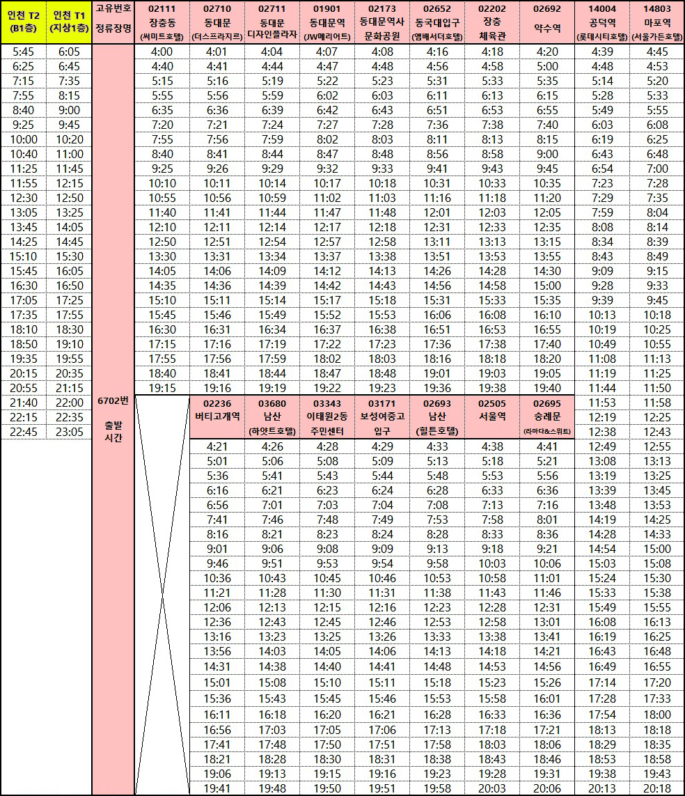 공항버스 6702 출발 시간표 동대문 남산 방면 ↔ 인천공항 리무진