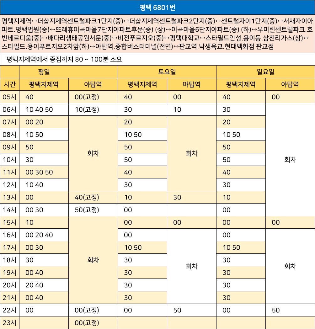 평택 6801번: 평택지제역↔더샵지제역센트럴파크1단지(중)↔더샵지제역센트럴파크2단지(중)↔센트럴자이1단지(중)↔서재자이아파트.평택법원(중)↔뜨레휴이곡마을7단지아파트후문(중) (상)↔이곡마을6단지아파트(중) (하)↔우미린센트럴파크.호반베르디움(중)↔배다리생태공원서문(중)↔비전푸르지오(중)↔평택대학교↔스타필드안성.용이동.삼천리가스(상)↔스타필드.용이푸르지오2차앞(하)↔야탑역.종합버스터미널(전면)↔판교역.낙생육교.현대백화점 판교점