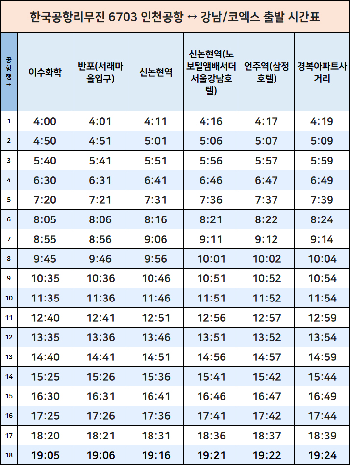 공항버스 6703 심야 N6703 운행 시간표 인천공항 ↔ 강남 방면 리무진