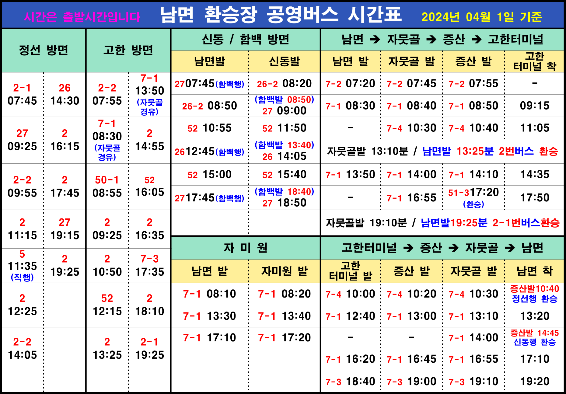 남면 환승장 공영버스 노선정보: 정선, 고한, 자뭇골, 신동/함백, 남면 → 자뭇골 → 증산 → 고한터미널, 자미원, 고한터미널 → 증산 → 자뭇골 → 남면